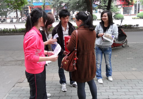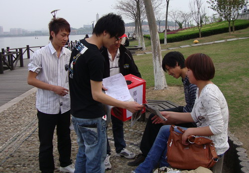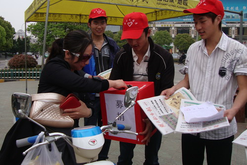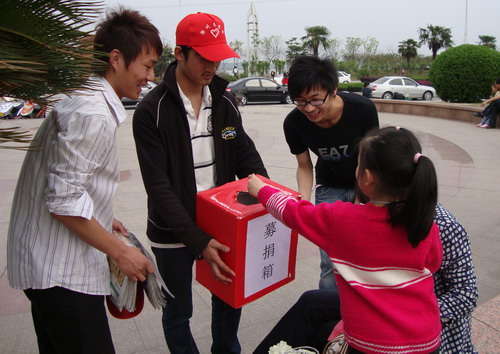 4月10日上午7点,由我校举办的“义务卖报、奉献爱心”为西南旱灾筹集善款活动拉开了序幕。210名大学生分为3组,分别到万联购物广场、银泰百货购物广场、武商量贩购物广场卖报纸并为灾区募捐。大学生们的义举感动了上万湖北民,很多人都来购买他们手中的楚天都市报。义卖活动在半天内就募得善款4912元。