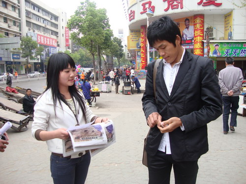 上午7点,210名大学生在学生会及青协干部的带领下,分别前往各自的目的地。在万联购物广场、银泰百货购物广场、武商量贩购物广场等人流量大的路段开始了义卖活动。大学生们身着统一的“青年志愿者”的袖章和会徽,分为三人一小组,一人手拿红色的募捐箱,一人拿着一叠楚天都市报在街头义卖,他们的举动也引起了大量市民的关注。学生会干部颜娟、蔡磊、刘桂明分别带领75、60、65名学子从建工学校3号教学楼前出发,沿着凤凰路向万联购物广场、银泰百货购物广场、武商量贩购物广场方向进发,每经过一个门面,他们都会走进店门,面带微笑地向商家讲明来意,并希望获得他们的捐助。万联广场的组长颜娟也是毫不含糊,不厌其烦地向市民讲明义卖活动的目的。