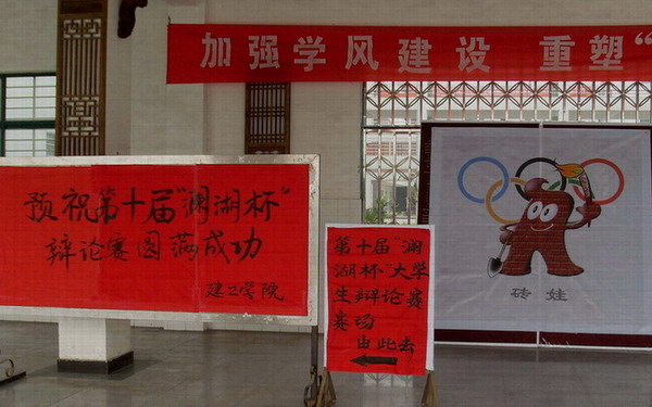 本届辩论赛本着“锻炼学生口才,增强团队精神,丰富文化生活”的原则,高举奥运旗帜,“唱响青春,颂中华奥运;辩响鄂大,展鄂大学子风采”。学校学生会同学结合学校专业特色自主研发了纪念吉祥物“砖娃”,作为全校同学参与此次活动的收藏纪念品。