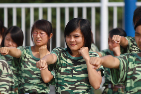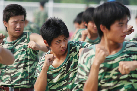 军训活动已经过去十天了,在军训教官的指导下,同学们主要进行了队列训练,以及内务整理等项科目的训练。从今天开始我校全体新生将进行擒敌拳的训练,这对参训同学,无疑又是一次严酷地考验。炎热、辛苦和疲劳是他们共同的感受,但同学都没有放弃,他们中间一些体力不支很难坚持的同学,也只是稍作休息后,便自觉归队参训。集体荣誉感、互帮互助是这次军训的两大亮点,