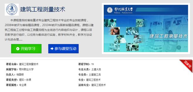 《建筑工程测量技术》课程,从2008年申报成为省级精品课程建设,2010年申报成为国家精品课程建设,2013年转型升级,教育部批准了2911门“国家级精品资源共享课”(包括本科教育、高职高专教育、网络教育课程)立项建设,建设课程陆续在“爱课程”网络上免费向社会开放。此次,教育部组织各省级教育行政部门、全国高校现代远程教学协作组、高等教育出版社有限公司等对精品开放课程建设与共享项目建设工作进行总结,并对已经上网使用的本科教育、高职高专教育以及网络教育国家级精品资源共享课程进行审核,2686门课程被确认为第一批“国家级精品资源共享课”称号,有效期五年。