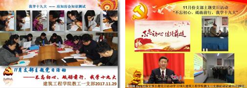 根据学校党委关于在“两学一做”学习教育和支部主题党日的总体部署,为深入学习宣传贯彻党的十九大精神,切实发挥领导干部骨干带头作用、党支部战斗堡垒作用和党员先锋模范作用,我校各党支部于11月29日下午开展了“不忘初心、砥砺前行,我学十九大”支部主题党日活动。