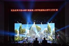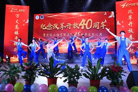 2018年,是改革开放40周年,也是湖北黄冈工业学校建院25周年。为纪念这一特殊的日子,讴歌改革开放成就,回顾湖北黄冈工业学校25年发展历程。12月23日晚,在大学生活动中心,我校隆重举行“纪念改革开放40周年暨湖北黄冈工业学校建院25周年文艺汇演”。校党委副书记周岫出席大会并讲话,校党委组织部、宣传部、学工部、后勤服务集团、校团委等相关单位主要负责人以及各院(部)领导、老师,湖北黄冈工业学校全体师生共计800余人参加大会。