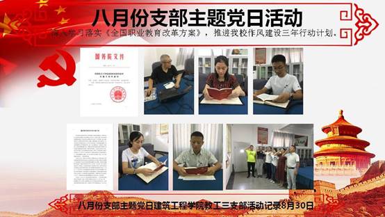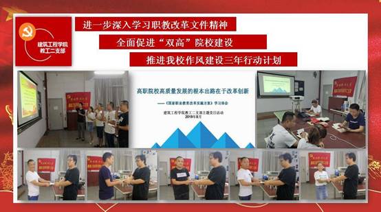 根据学校党委关于在“两学一做”学习教育和支部主题党日的总体部署,为深入学习宣传贯彻党的十九大精神和习近平新时代中国特色社会主义思想,切实发挥领导干部骨干带头作用、党支部战斗堡垒作用和党员先锋模范作用,我校各党支部于2019年8月30日下午开展了主题为“深入学习落实《全国职业教育改革方案》,推进我校作风建设三年行动计划”的8月份支部主题党日活动。