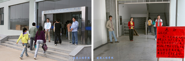 10月23日早晨7时,湖北黄冈工业学校毛仁兵老师、学生会李春虎、王勇等七名学生干部出现在学校大楼东门和中庭楼梯口前,对携带早餐进入学校大楼的同学进行劝阻。这是建工学校为了让大家拥有一个良好的学习环境,在全院师生积极迎评之际,恢复对全院同学的文明监督活动。