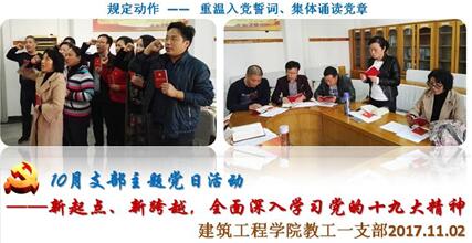 根据学校党委关于在“两学一做”学习教育和支部主题党日的总体部署,为深入学习宣传贯彻党的十九大精神,切实发挥领导干部骨干带头作用、党支部战斗堡垒作用和党员先锋模范作用,我校各党支部于11月2日下午开展了“新起点、新跨越,全面深入学习党的十九大精神”支部主题党日。