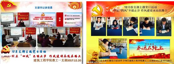 根据学校党委关于在“两学一做”学习教育和支部主题党日的总体部署,为深入学习宣传贯彻党的十九大精神,切实发挥领导干部骨干带头作用、党支部战斗堡垒作用和党员先锋模范作用,我校各党支部于12月20日下午开展了“纠正‘四风’不能止步 作风建设永远在路上”支部主题党日活动。