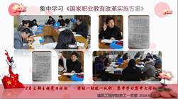 各支部主题党日按照“3+X”(重温入党誓词、集体诵读党章、自觉缴纳党费等3个规定动作+若干自选动作)的方式进行,支部书记带头学习国务院下发的《国家职业教育改革实施方案》精神,围绕校领导提出的“六个问题”展开大讨论,形成支持关心学校改革发展的良好氛围。