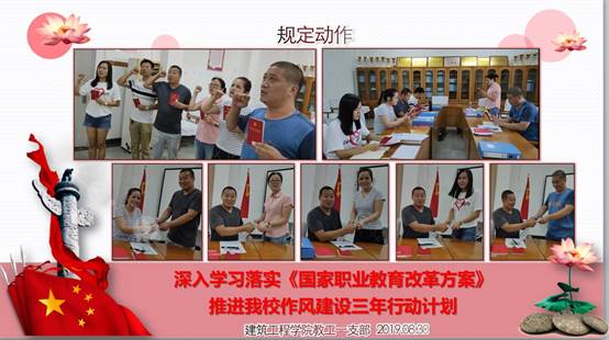 根据学校党委关于在“两学一做”学习教育和支部主题党日的总体部署,为深入学习宣传贯彻党的十九大精神和习近平新时代中国特色社会主义思想,切实发挥领导干部骨干带头作用、党支部战斗堡垒作用和党员先锋模范作用,我校各党支部于2019年8月30日下午开展了主题为“深入学习落实《全国职业教育改革方案》,推进我校作风建设三年行动计划”的8月份支部主题党日活动。